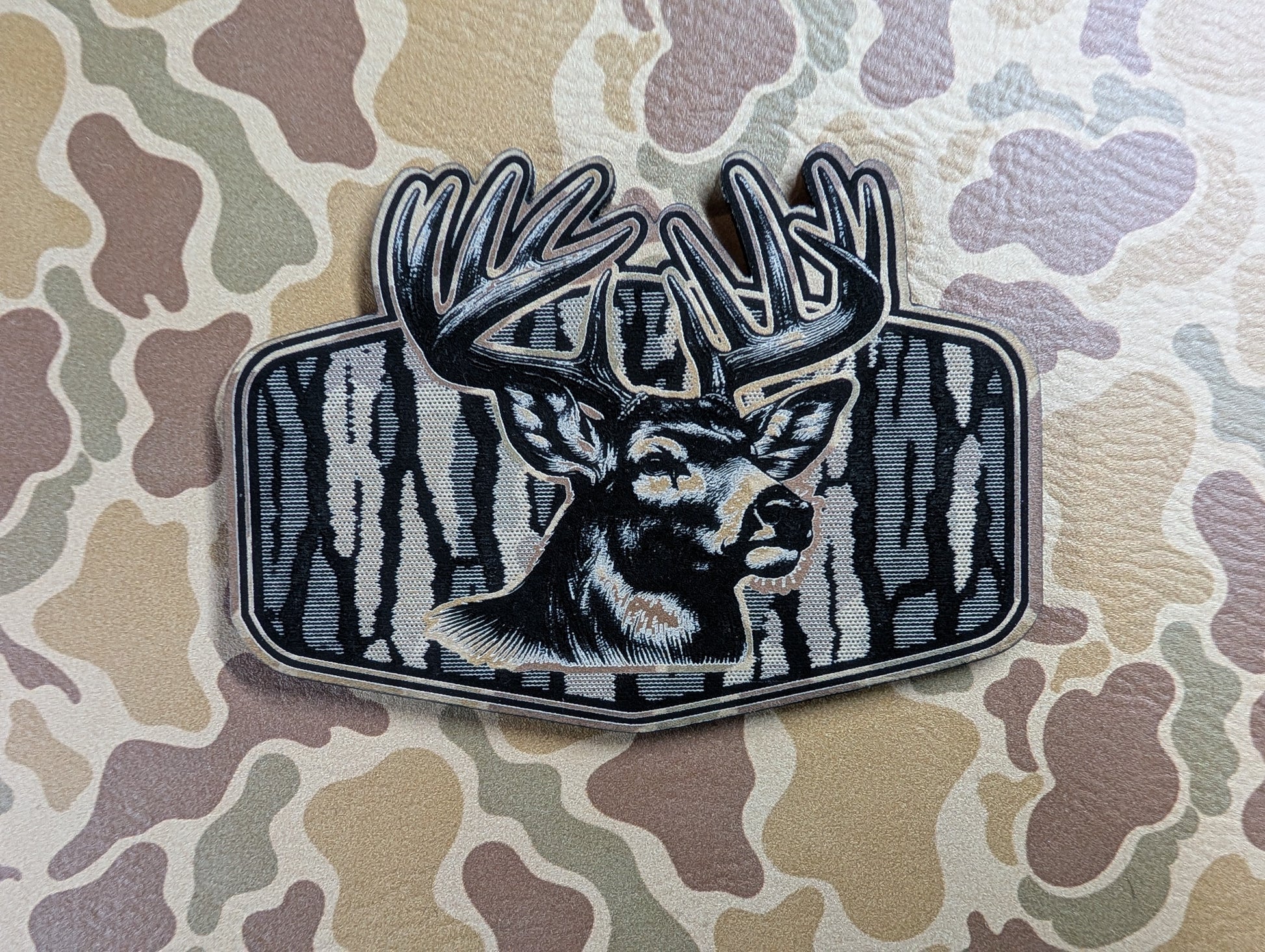 This exclusive hat features our stunning, laser-engraved Camo Buck Patch, meticulously detailed with a buck against an engraved tree bark background on durable camo leatherette.
